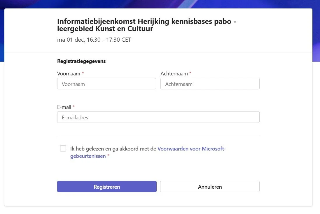 Informatiebijeenkomst leergebied kunst en cultuur: 1 december 2025 van 16.30 - 17.30 uur. Aanmelden via deze link.